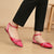 Flat mule in pointed shape made in hot pink color with matching rhinestone chain .