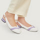 Flat mule in pointed shape made in hot pink color with matching rhinestone chain .