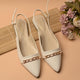Flat mule in pointed shape made in hot pink color with matching rhinestone chain .